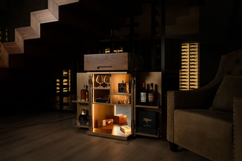 We have designed a Cabinet that can hold all your accessories such as the ashtray, table lighter, glasses in various sizes, and all your precious bottles. Equipped with LED lights and mirrors for warm and welcoming illumination. The doors open 180 degrees with a sturdy capacity and space for bottles. Our Cabinet is custom-designed to support our stone and wood humidor but can be used separately according to your preferences. Available in various metal-effect finishes.